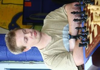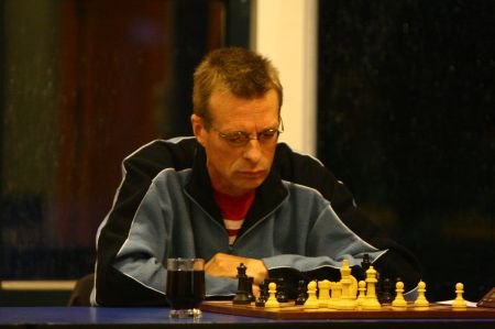 Erwin is wat later en begint met ongeveer een kwartier minder bedenktijd. Met zwart tegen een gesloten siciliaan. Wit speelt het met f4, een soort Grand-Prix met de witveldige loper binnen de keten. Het is een niet erg ambiteuze opzet. Lange tijd is er niet veel aan de hand en is de stelling ongeveer gelijk. Wit speelt op een doorbraak met f5. Zwart brengt zijn pionnen op de damevleugel naar voren Tegen de eerste tijdcontrole heeft zwart een duidelijke plus en in het laatste half uur zal moeten worden toegeslagen.