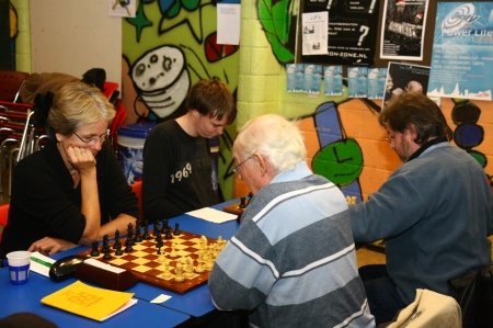 Snel nog even bij de andere partijen kijken dan, altijd leuk als je zelf al klaar bent en de rest nog zit te zwoegen. Zoals Maarten ook al beschreef was de overwinning nog lang niet binnen. En hier en daar begon bij menig speler de tijd ook te dringen wat resulteerde in zenuwachtig gewiebel op stoelen, geroffel met schoenen, rode hoofden, zweethanden die werden droog gewreven, prachtig! Iedereen weet hoe het voelt als je na ruim 3 uur schaken op dat punt bent gekomen. Na al die inspanning wil je in tijdnood geen blunders maken. Andere spelers die reeds klaar zijn schuivelen fluisterend om je heen, zien winnende varianten en maken inschattingen van de borden.