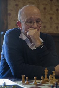Een deel van de toeschouwers krijgen een gelukzalige uitdrukking op hun gezicht bij het zien van deze stelling. Zwart gaat verder met 22.. f5 en na 23. exf5 Tf6! gaat de dame verloren. De rest gaat nog flink moeizaam. Olaf heeft vrijwel alle bedenktijd nodig. Met nog vijf minuten op de klok houdt Olaf op met noteren. Niels heeft nog zo'n twintig minuten. Niels wil het proces wat versnellen en beantwoordt de zetten van Olaf a tempo, zonder te noteren. Arbiter Erwin Hoogenes (foto) grijpt (terecht) in. "We zijn hier niet aan het vluggeren, heren! U moet blijven noteren!" Het loopt allemaal goed. Olaf moet nog wel even zijn dame voor de toren geven. Daarna kan het witte paard de opstomende zwarte pionnen niet meer keren en geeft hij op.