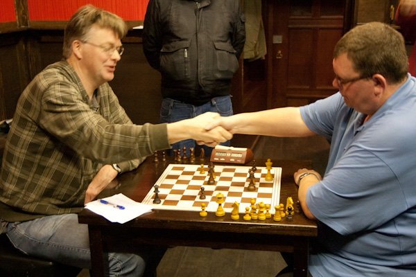 Olaf neemt de gelukwensen in ontvangst. Het is zeven uur en de stand is nu gelijk. Nog twee borden over, Erwin en Bert. Dit moet toch zeker wel anderhalve punt opleveren...